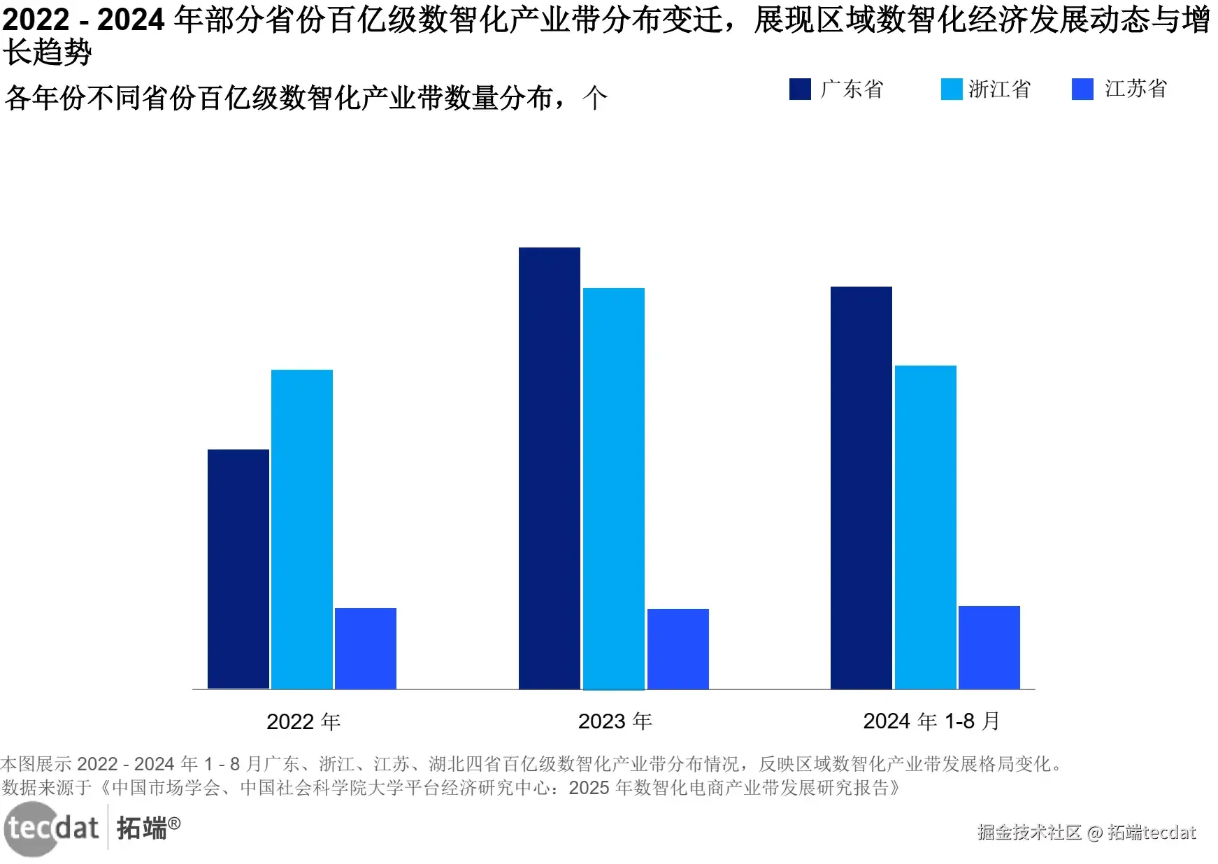 数字经济的繁荣为电商行业奠定了坚实基础。2023年,数字经济核心产业增加值占GDP比重达10%,互联网业务收入同比增长6.8%,软件业务收入突破12万亿元。在这一趋势下,产业带发展模式从地理集聚向数字共生转变。广东、浙江等沿海省份凭借自身优势率先完成转型,在数字经济浪潮中拔得头筹;湖北等中部地区也不甘落后,逐步追赶,积极融入数字经济发展的洪流。