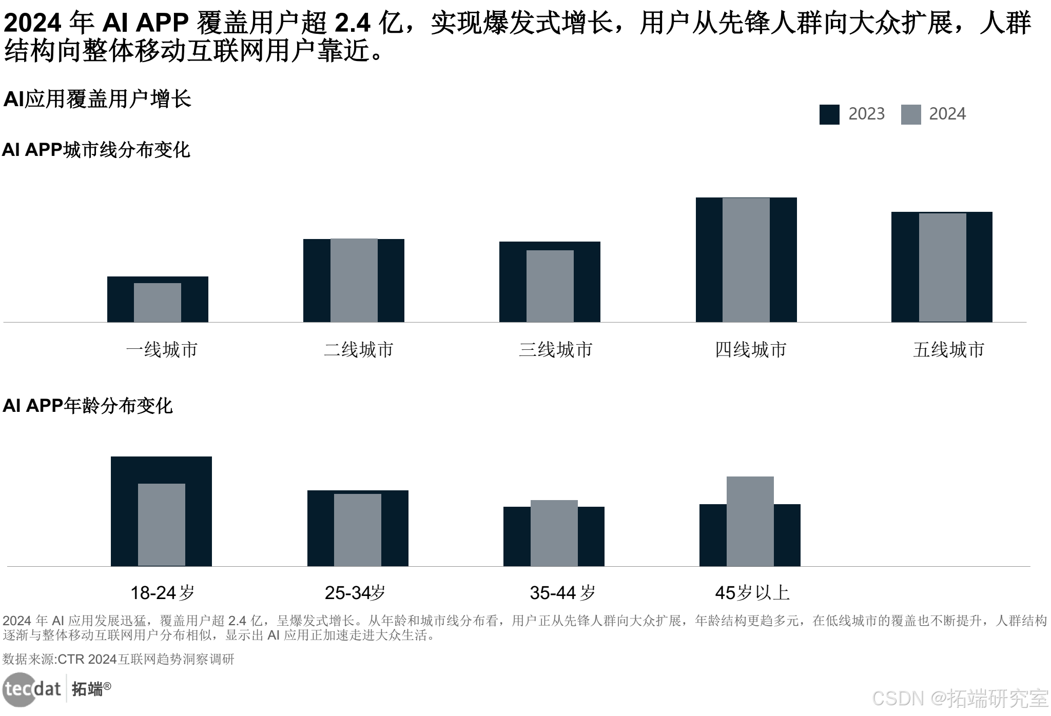 AI应用在2024年迎来爆发式增长,截至2024年12月,AI APP覆盖用户超2.4亿。其用户分布逐渐从先锋人群向大众拓展。在年龄维度,各年龄段用户占比逐渐均衡;城市线方面,低线城市用户占比增加。