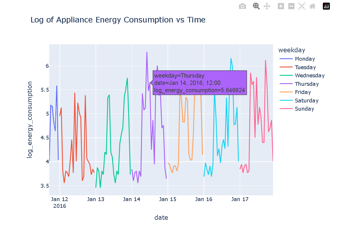 使用plotly.express绘制能耗随时间变化的折线图,展示不同星期几的对数能耗情况。