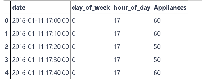 我们使用了一个能耗数据集,为了简化和加快运行速度,只选取了时间相关和自回归相关的特征,包括日期时间(每10分钟采样一次)、能耗(对应10分钟时间戳的瓦时)、星期几(星期一对应0)、一天中的小时数。