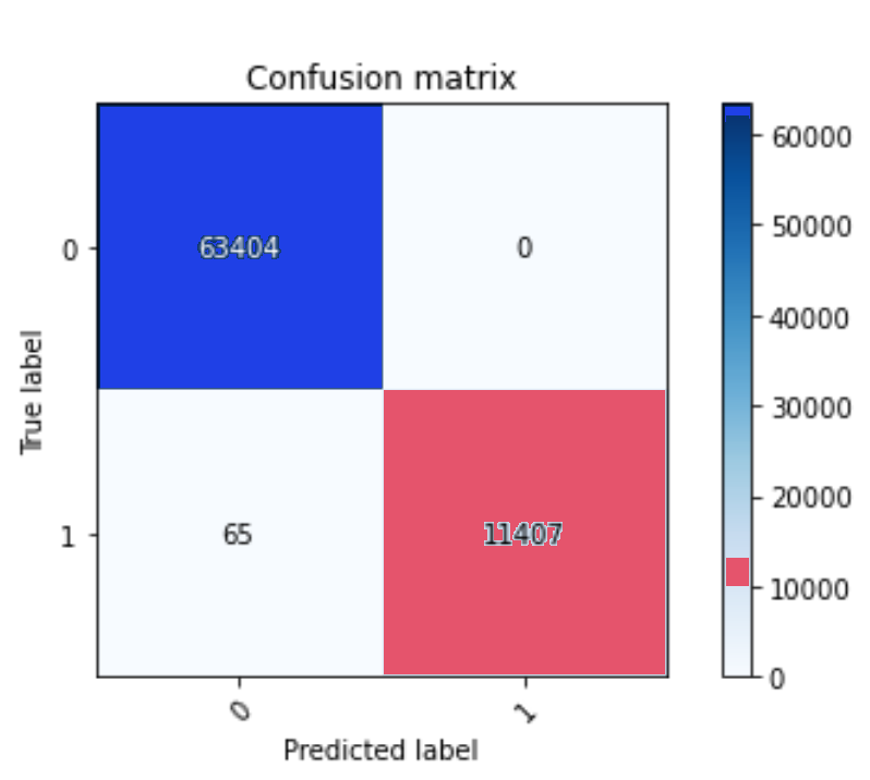 模型训练完成后,计算训练样本和测试样本的预测结果。由于模型设定树的数量为1000棵,最终预测结果是1000个小模型结果的平均值,呈现为小数,通过四舍五入处理。模型的混淆矩阵如下: