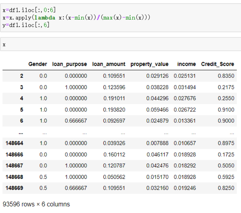 清洗后的数据中,第一列和第二列的数据为字符型,为方便后续建模,需进行数值化处理。数值化规则设定为:{“p1”:1, “p2”:2, “p3”:3, “p4”:4} ,{“Male”:0, “Joint”:1, “Female”:2},其中“Joint”表示男女共同贷款。
