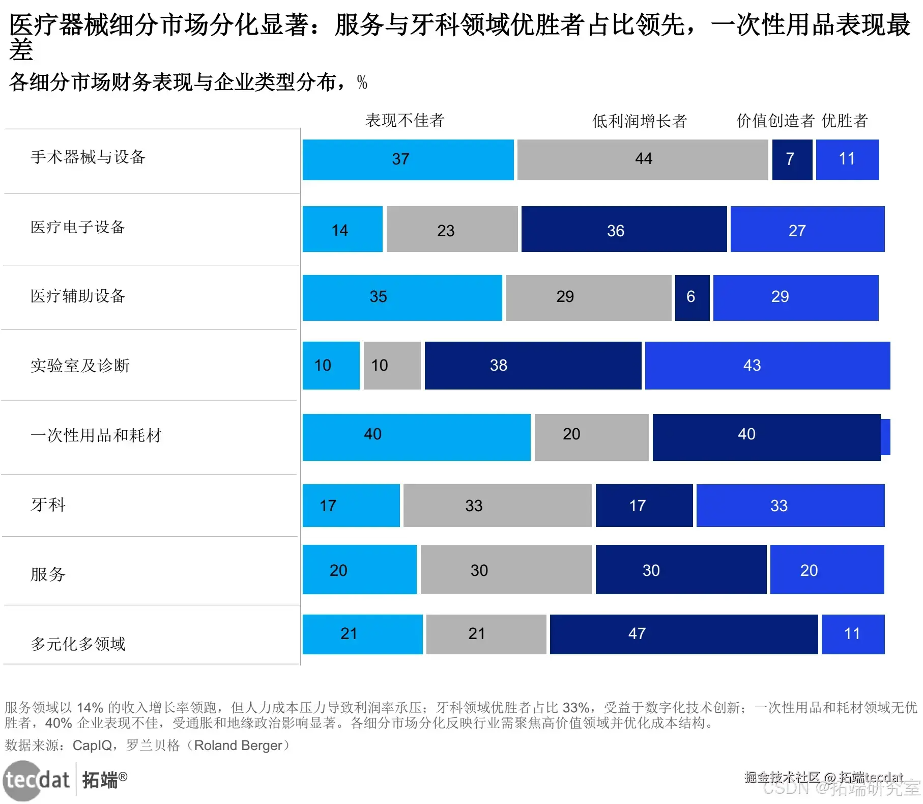 图表4:全球医疗器械行业关键指标变化(2020–2023年)显示,行业平均营业利润率从19%降至15.9%,制造成本占比升至49.6%,但牙科、手术机器人等细分领域通过AI创新(如达芬奇机器人)实现年均16%增长,研发投入占比7.3%,凸显差异化竞争优势。