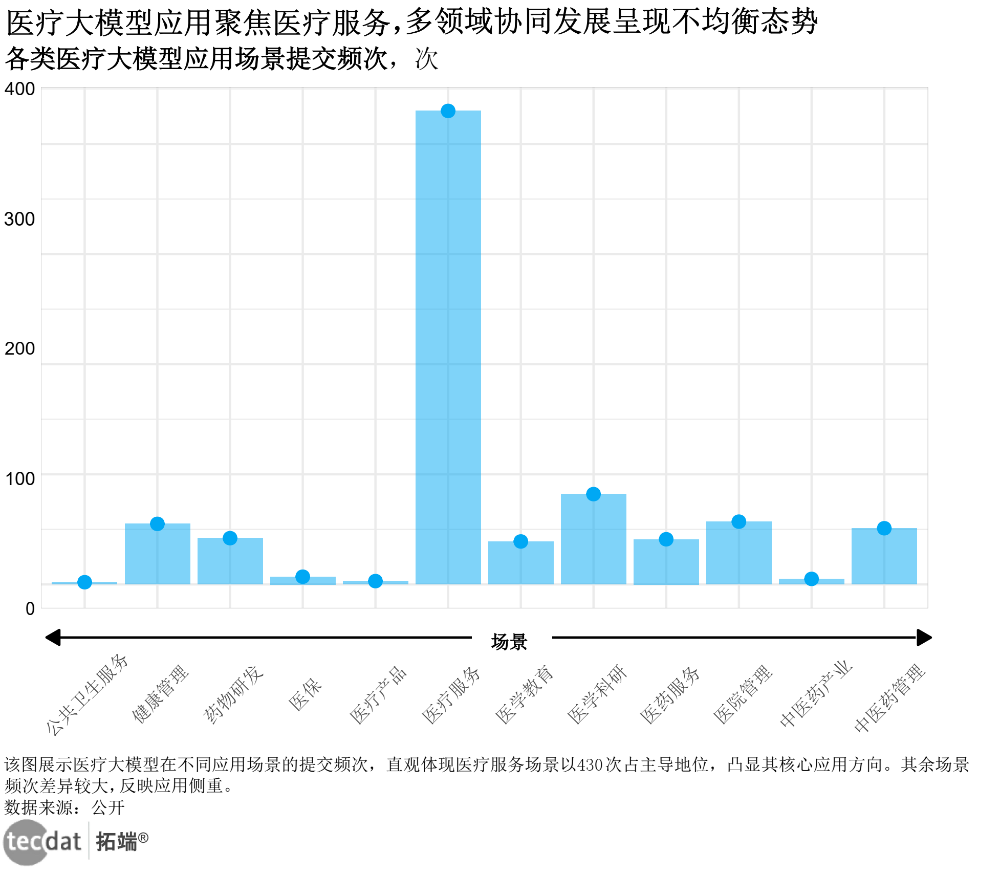 医疗服务是大模型应用最集中的领域,提及频次占比达53%。临床专病辅助决策、预问诊、病历辅助生成、医学影像辅助诊断为四大核心场景。图表2:各类医疗大模型应用场景提交频次显示,医疗服务场景提及频次达430次,远超其他领域。例如,数坤科技“数坤坤”多模态大模型在北京市科委大赛中以99例诊断与专家一致的成绩,展现高精准度。