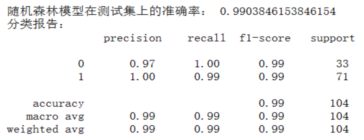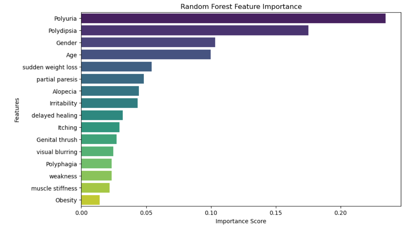 随机森林通过自助采样和随机特征选择构建多棵决策树,以投票机制提升预测鲁棒性。该模型无需复杂调优即达99.04%的测试集准确率,特征重要性分布与逻辑回归、决策树高度一致,再次验证核心症状的关键作用(图8、图9)。
