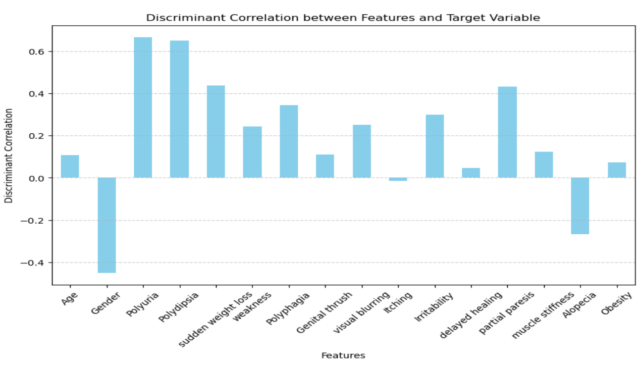 通过判别相关系数分析特征与患病风险的关联性,发现多尿(Polyuria)和多饮(Polydipsia)的正相关性最强,提示这两项症状是糖尿病的核心预警信号;性别(Gender)呈现负相关,表明男性患病概率高于女性(图2)。