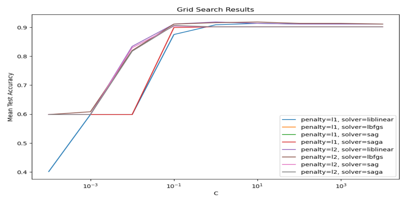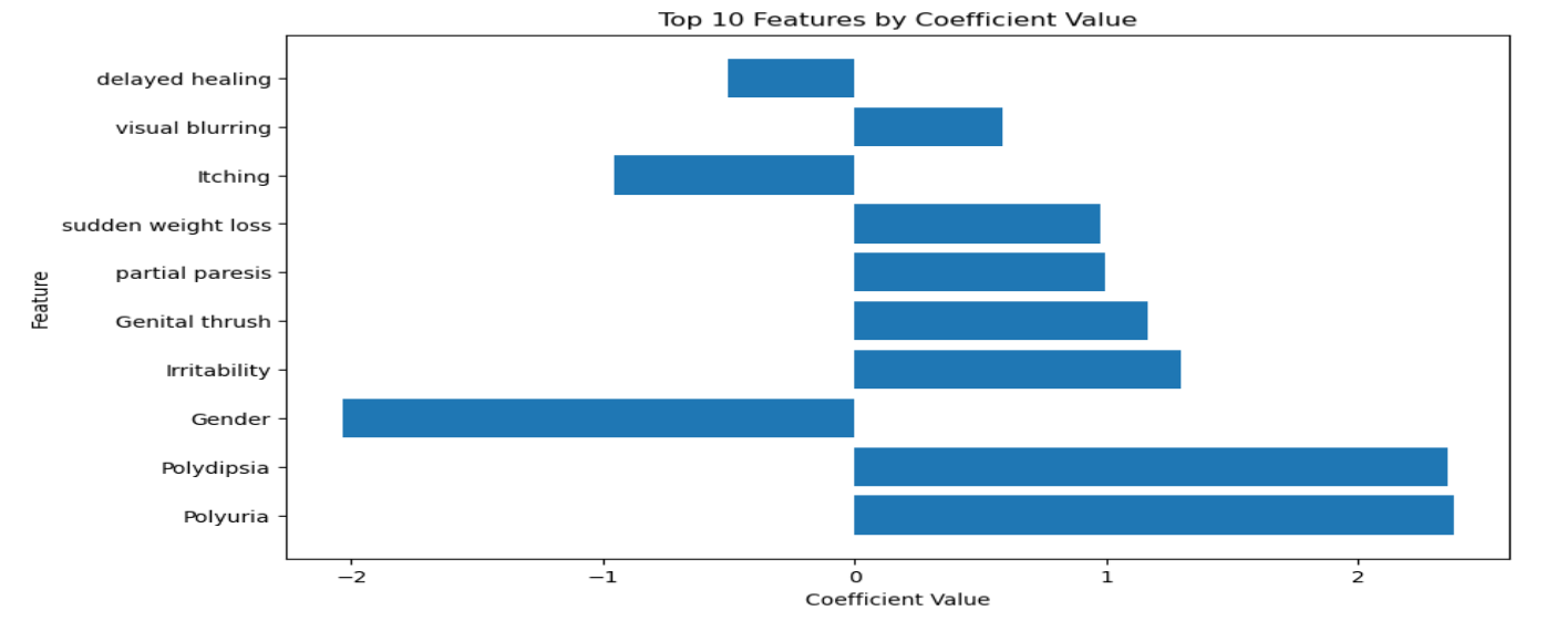 其中,(w_i)为特征权重,反映症状对患病风险的影响程度。初始模型测试集准确率为93.27%,经网格搜索调优(AI提示词:用网格搜索优化逻辑回归正则化参数,提升医疗分类模型准确率),确定最优参数为C=1、solver=‘saga’,调优后模型对多尿、多饮的正向权重显著增强(图6)。