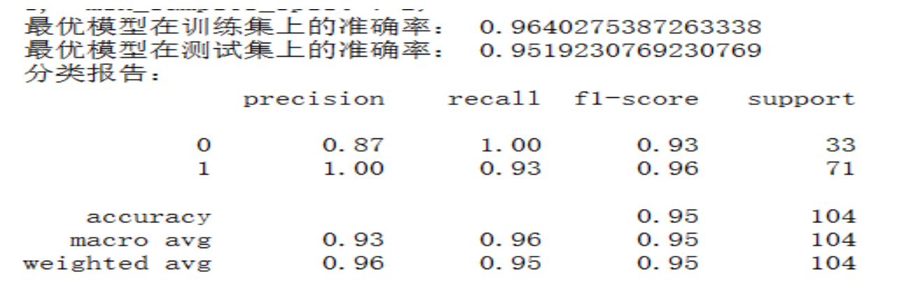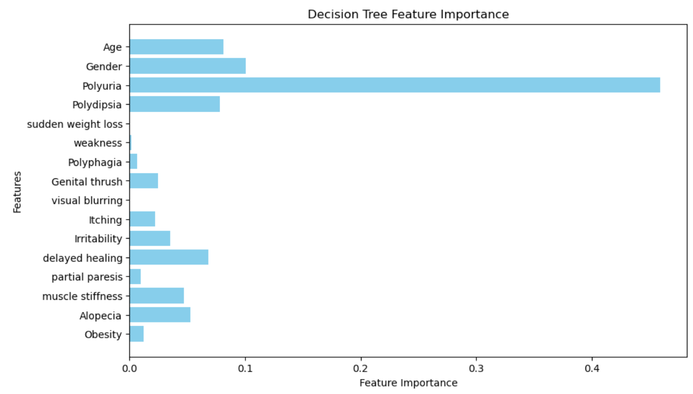 决策树通过基尼系数递归划分特征,形成可解释的分类规则。初始模型测试集准确率达95.2%,网格搜索显示默认参数(基尼系数划分、无深度限制)即达最优性能,特征重要性排序显示多尿、性别、年龄为前三大影响因素(图7)。