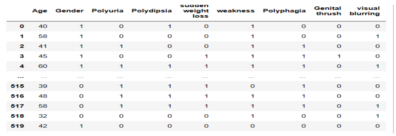 本研究采用某医疗数据集(包含520条样本、16项特征变量),涵盖年龄、性别及多尿、多饮、肥胖等临床症状指标。数据预处理需解决非结构化数据转换与关键特征识别两大核心任务。
