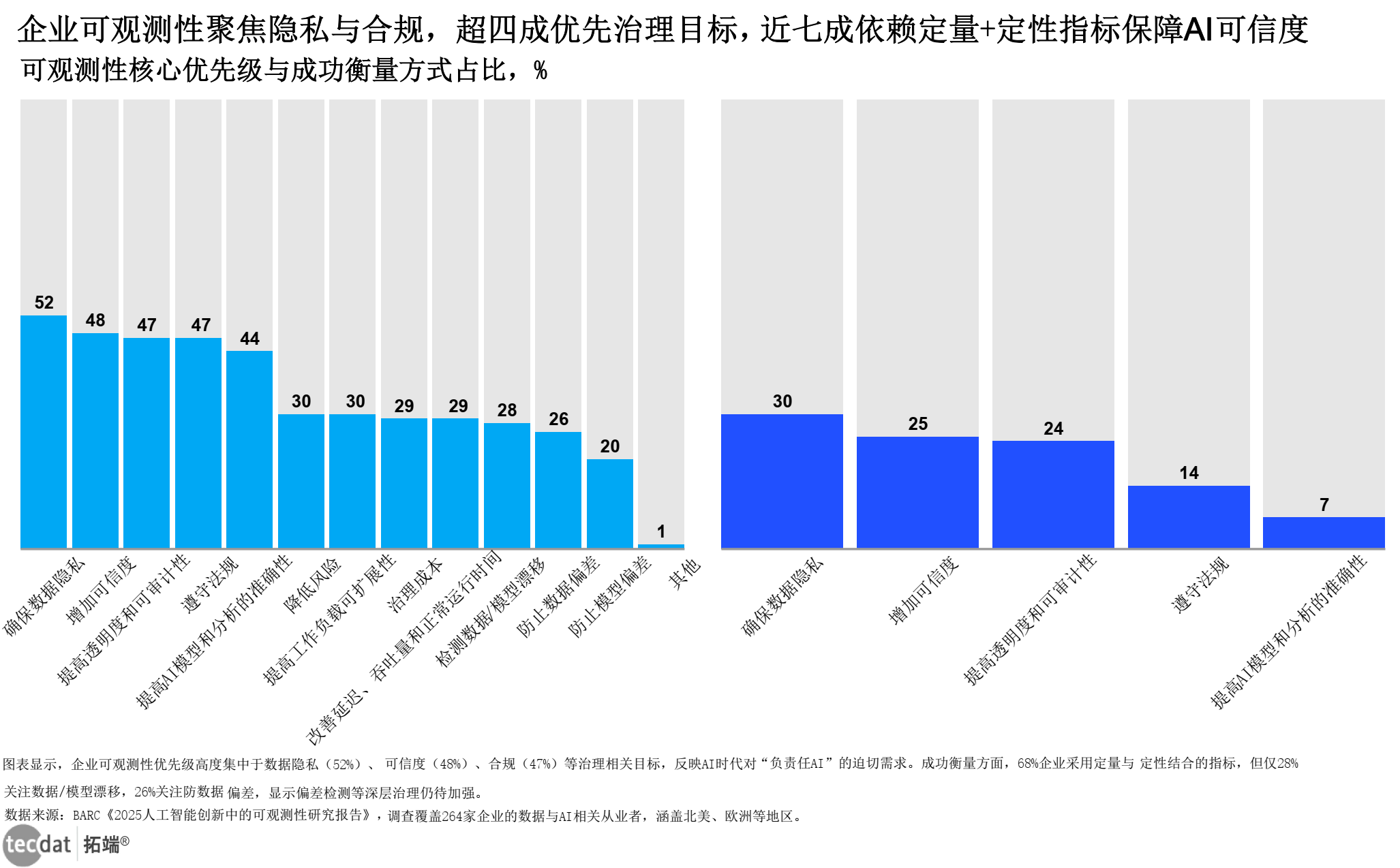 在应用层面,生成式AI(GenAI)的普及推动可观测性需求向非结构化数据延伸。40%的企业将文本、图像、音视频等非结构化数据治理列为优先事项,33%的受访者关注向量数据库监控与元数据管理。然而,仅有28%的企业将数据/模型漂移检测作为核心目标,26%关注数据偏差预防,反映出深层治理能力仍待提升。