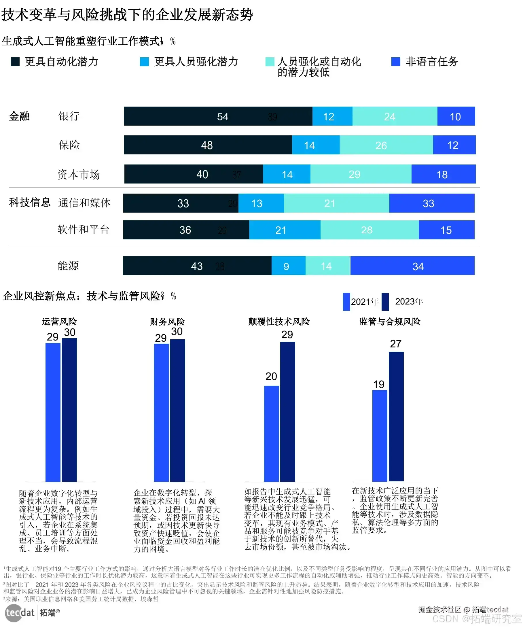 生成式人工智能重塑了行业工作模式,但也带来了技术与监管风险。在一些行业,生成式人工智能的应用使得工作流程更加自动化,提高了工作效率,但也可能导致员工技能需求的变化和就业结构的调整。同时,技术的快速发展使得监管政策难以跟上步伐,企业在应用新技术时可能面临合规风险。企业需要加强风险防控措施,以应对这些挑战。