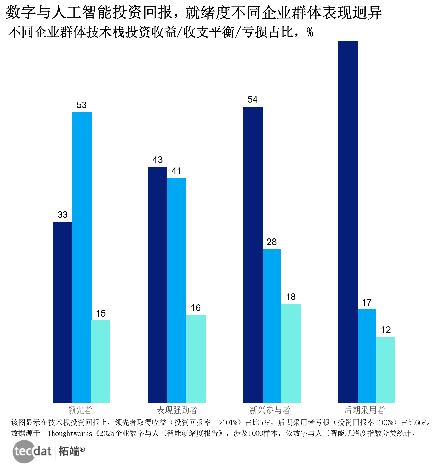 值得注意的是,即使在领导者中,33%仍面临短期亏损,反映技术创新的长期投入特性。后期采用者则因聚焦运维效率,虽短期可见局部收益,但缺乏数字韧性,难以抵御市场波动。