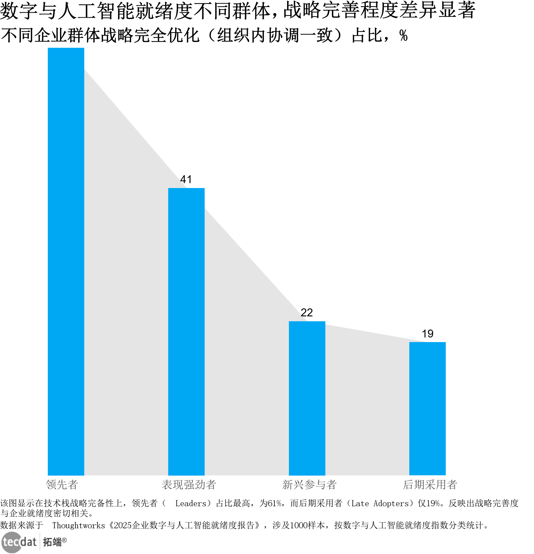 反观新兴参与者与后期采用者,战略碎片化问题显著。仅22%的新兴参与者达成战略全组织对齐,其技术投资常聚焦单一领域,导致部门间目标冲突。报告强调,战略不应停留于PPT,而需通过平台工程、AI嵌入产品开发等机制转化为组织能力。