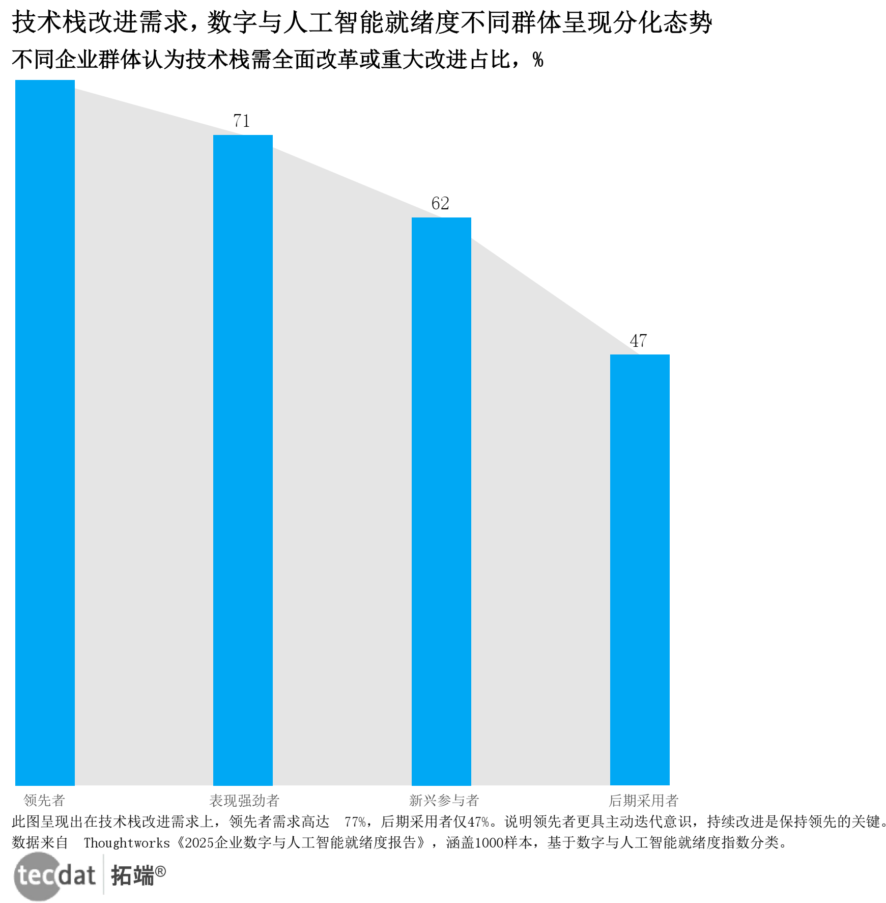 尽管已处于行业标杆地位,77%的领导者仍认为需对技术生态进行“全面改革或重大改进”,该比例比后期采用者(47%)高30个百分点。这种“持续进化”的心态体现在技术架构升级上——领导者更倾向采用云原生、 composable架构,而非固守 legacy系统。