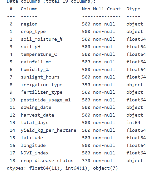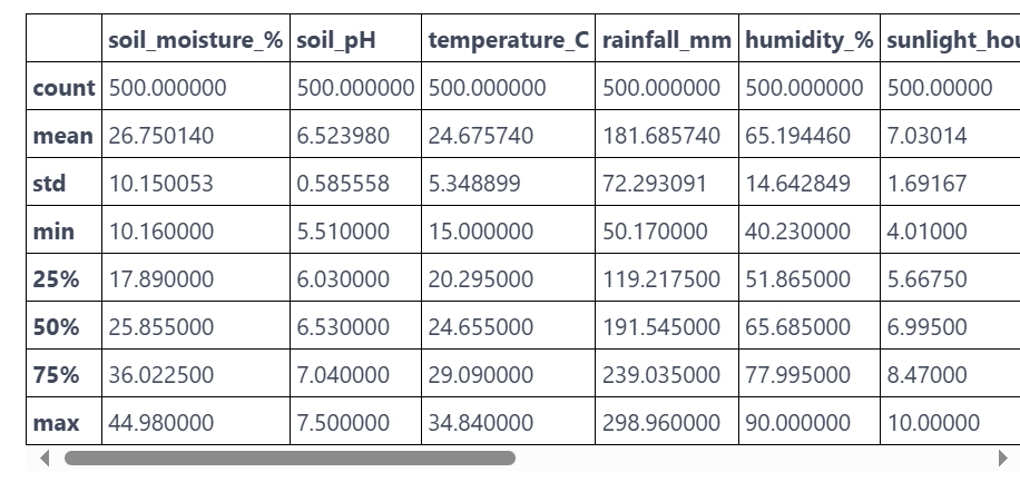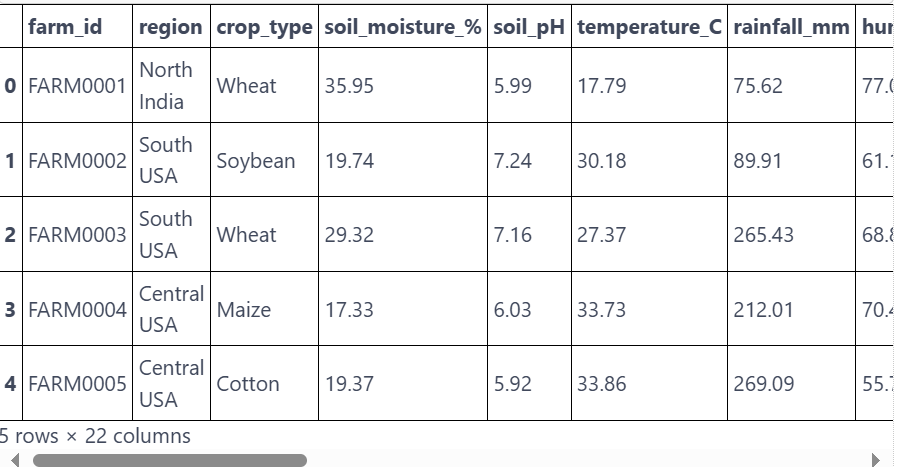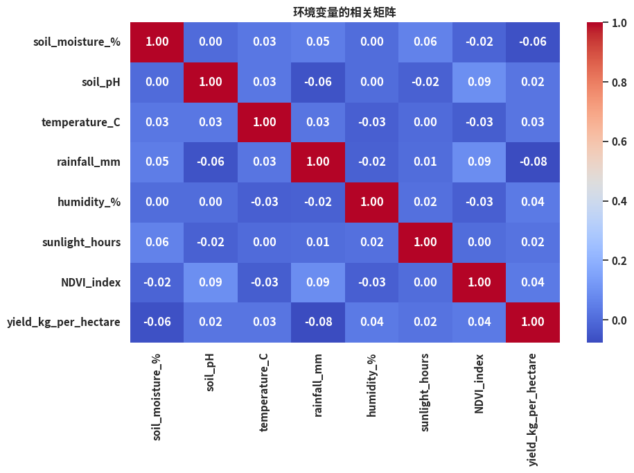 env_vars = ["soil_moisture_%", "soil_pH", "temperature_C", "rainfall_mm", "yield_kg_per_hectare"]