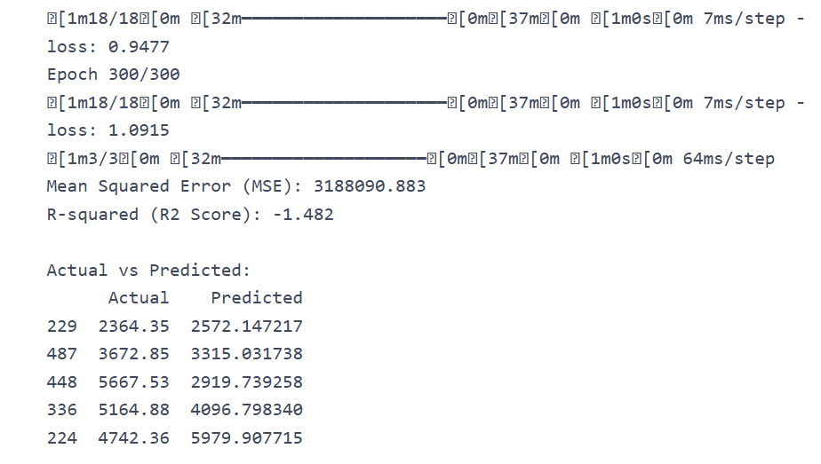 构建多层感知机模型,包含6个隐藏层(神经元数依次为64、64、32、32、16、8),采用ReLU激活函数与均方误差损失函数。训练结果显示,测试集R²为0.68,MSE为125.3,预测效果未达预期,推测高维特征空间中存在信息冗余。