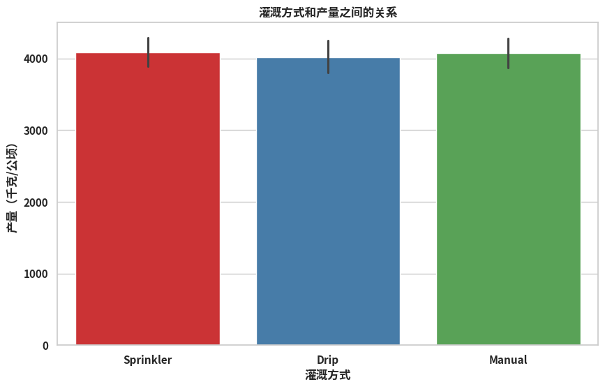 柱状图显示不同灌溉方式的平均产量差异显著,滴灌模式下产量均值最高;箱线图则揭示施肥类型对产量稳定性的影响,有机肥组的产量波动范围最小。