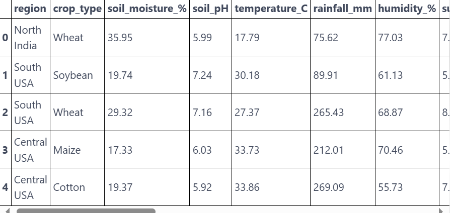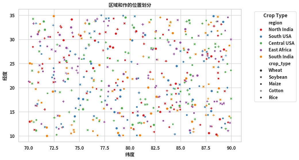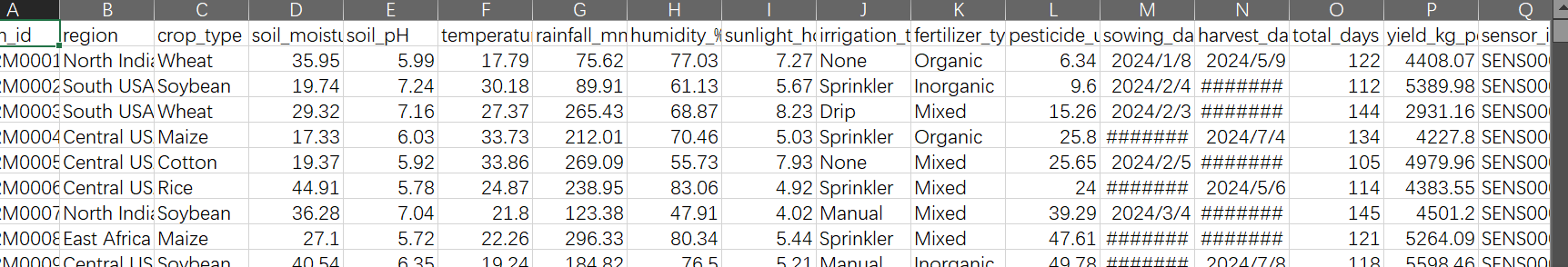 农业生产数据具有多源性、时序性特点,本次分析聚焦于包含12个字段的"农产品产量预测.csv"数据集,涵盖区域、作物类型、土壤湿度、降雨量等关键变量。首先通过数据读取与基础观测,初步掌握数据结构特征。