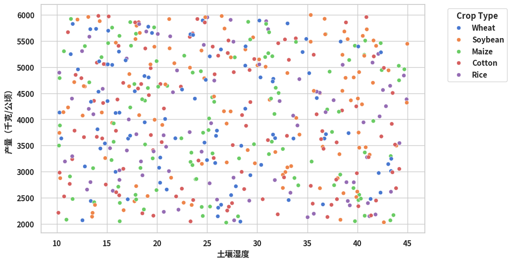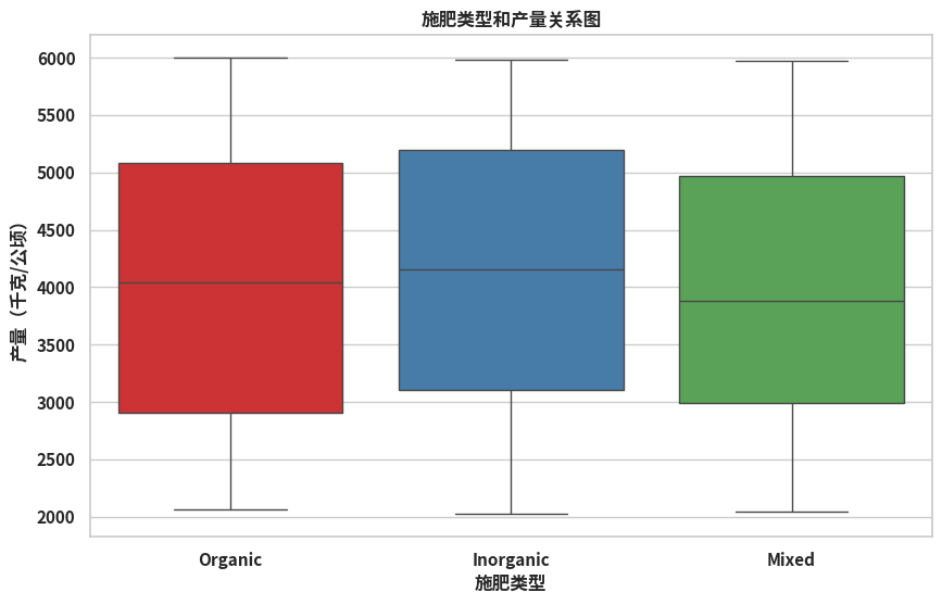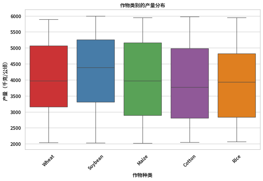 箱线图显示不同作物类型的产量分布存在显著差异,为种植结构优化提供数据支撑。