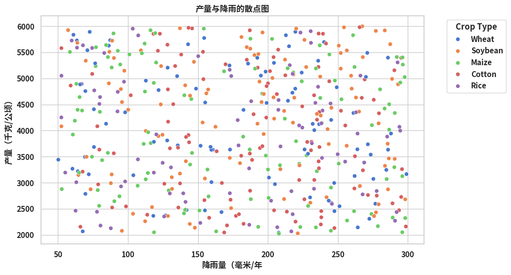 散点图表明降雨量与产量呈非线性相关,高降雨量区间存在产量阈值效应;热力图则显示土壤湿度、温度、NDVI指数等变量与产量的相关系数绝对值超过0.3,具有较强关联性。