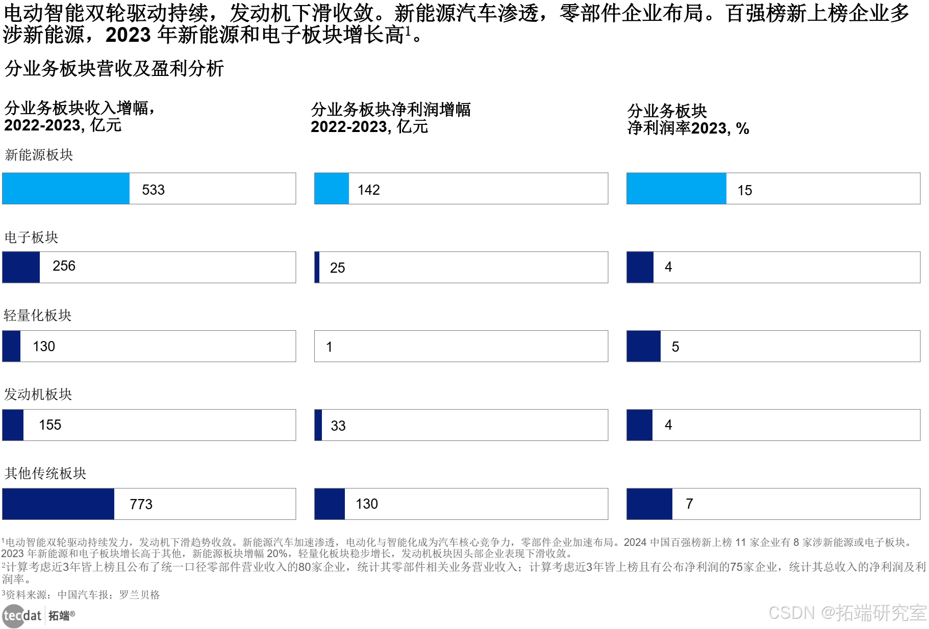 电动化与智能化成为汽车核心差异化竞争力,零部件企业加速布局新能源领域。2024年中国百强榜中,新上榜的11家企业里有8家涉及新能源或电子板块。2023年新能源板块收入增幅达20%,轻量化板块稳步提升,发动机板块因头部企业表现下滑态势收敛。