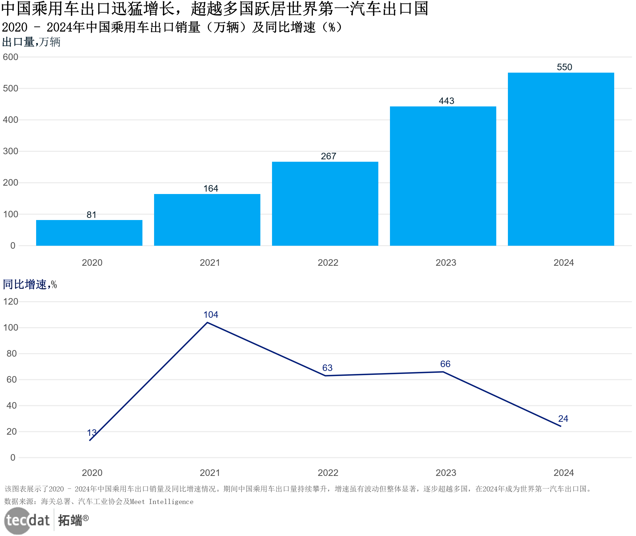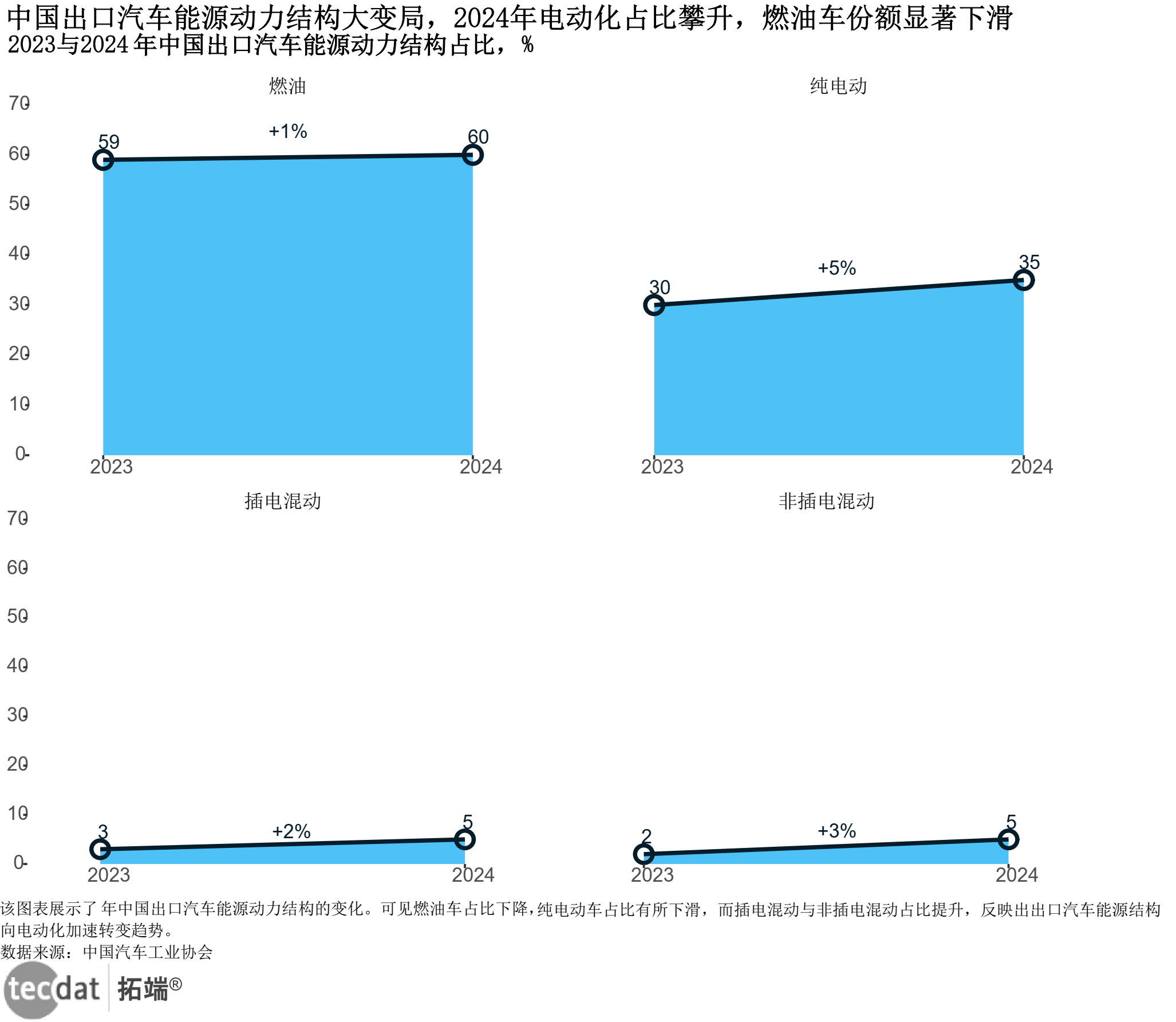 中国乘用车出口自2020年起开启爆发式增长,2024年以550万辆销量稳居全球第一,较2020年的81万辆实现近7倍增长。从增速看,2021年同比增速达104%的峰值,随后虽有所波动(2022年63%、2023年66%、2024年24%),但持续领跑全球市场。出口结构呈现显著转型特征:燃油车占比从2023年的59%微降至2024年的59%,纯电动车占比从30%提升至35%,插电混动与非插电混动分别从3%、2%增至5%、5%,电动化车型成为增长新引擎。