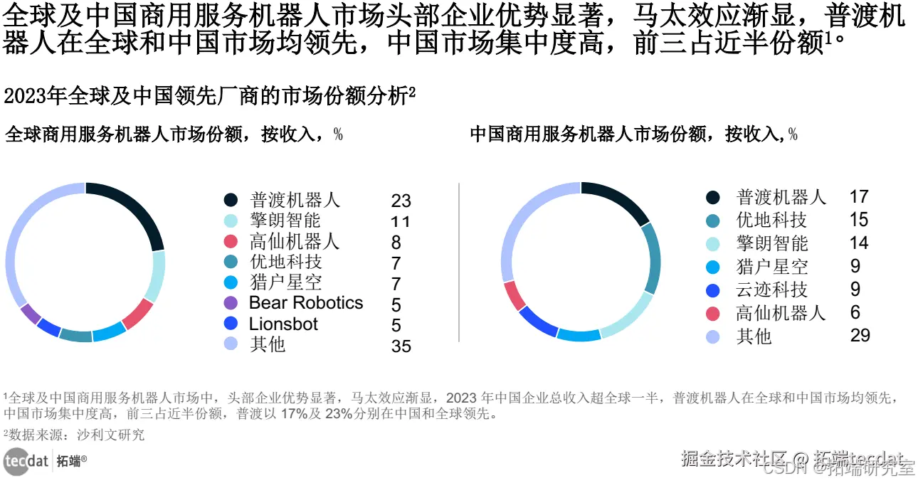 - 全球商用服务机器人市场:中国企业收入占比52%,普渡(23%)、猎户星空(12%)位列前二;