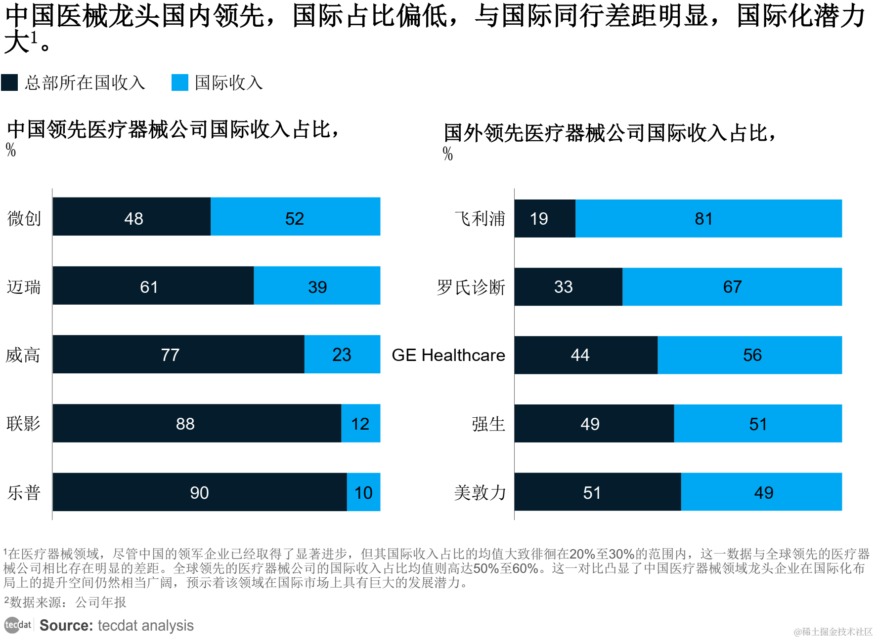 相比之下,国际领先的医疗器械公司则在国际市场上占据了更为重要的地位,其国际收入占比均值普遍达到了50%至60%。这一数据不仅彰显了这些企业在全球范围内的竞争力,也反映了它们对国际市场的深度参与和广泛布局。通过对比可以看出,中国医疗器械领域龙头企业的国际收入占比与国际领先企业存在显著差距。这一差距不仅体现在具体的数值上,更反映出中国医疗器械企业在国际化布局方面仍有较大的发展空间和潜力。