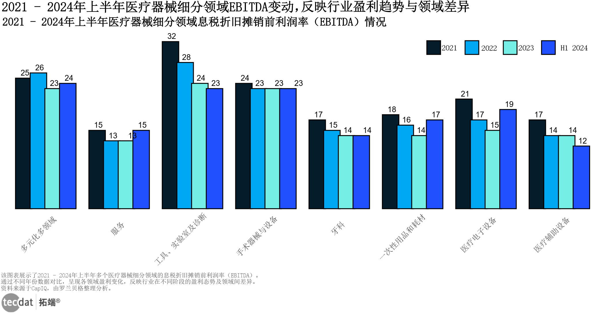 该图表展示了2021 - 2024年上半年多个医疗器械细分领域的息税折旧摊销前利润率(EBITDA)。 通过不同年份数据对比,呈现各领域盈利变化。反映行业在不同阶段的盈利态势及领域同差异。