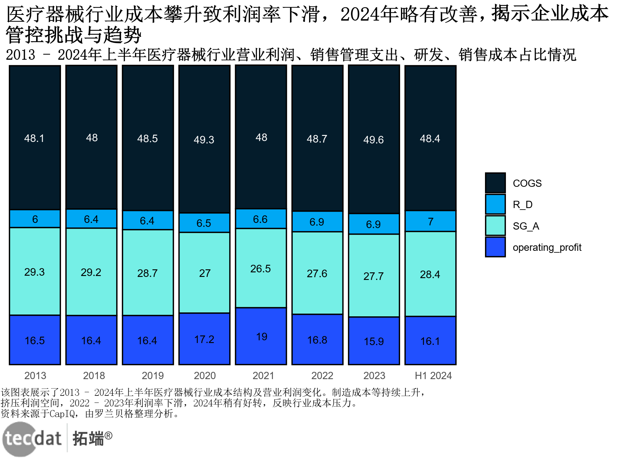 近年来,医疗器械行业面临全球化成本压力的持续冲击。新冠疫情与地缘政治冲突推高能源、原材料价格,叠加通胀导致的工资与融资成本上升,行业平均营业利润率从2021年的19.0%降至2023年的15.9%,2024年上半年虽小幅回升至16.1%,但整体仍处于低位。从成本结构看,销售成本(COGS)占比从2020年的48.0%攀升至2023年的49.6%,销售管理支出(SG&A)占比同步从26.5%增至27.7%,非制造成本的刚性上涨成为企业核心挑战。