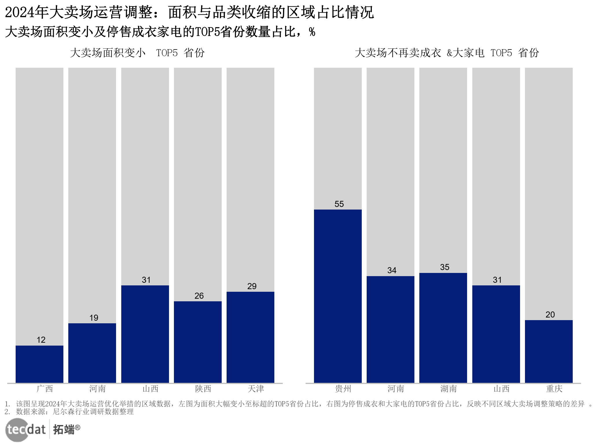 图注:左图为大卖场面积缩小至标超的TOP5省份占比(山西31%、天津29%、陕西26%、河南19%、广西12%),右图为停售成衣家电的TOP5省份占比(贵州55%、湖南35%、河南34%、山西31%、重庆20%),数据来源:尼尔森IQ零售核查