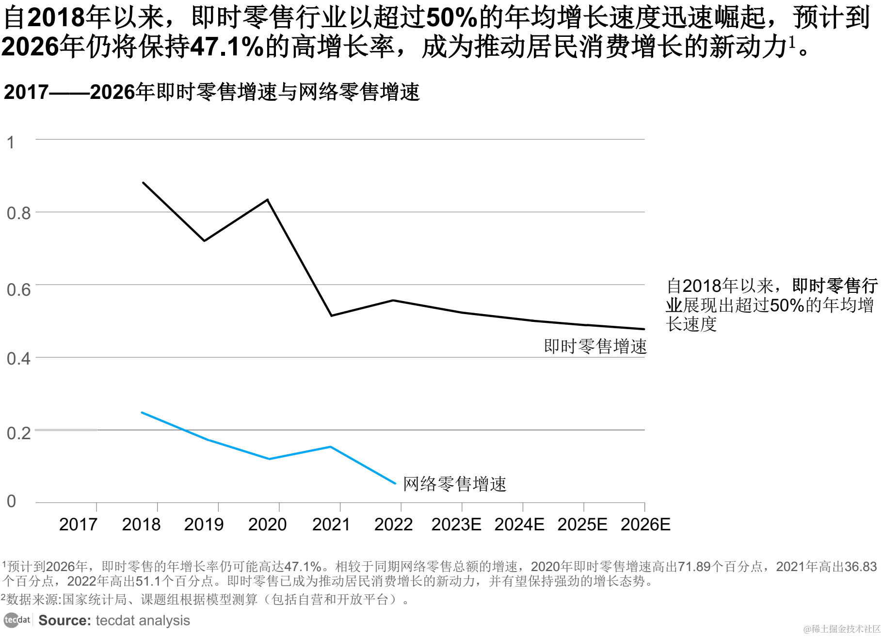 即时零售爆发:即时零售市场规模从2017年365亿元跃升至2022年5042亿元,年均增速超50%,预计2026年达2.5万亿元,O2O平台与前置仓模式成为增长引擎。