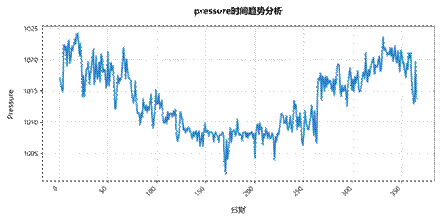 通过滑动窗口机制解析时序特征发现,温度类指标呈现典型正弦波动,夏季均温达30.2±1.8℃,冬季降至19.5±2.3℃,年温差达10.7℃,符合温带季风气候特征。气压变化呈现反相位季节响应,夏季平均气压较冬季低,印证了"热低压-冷高压"的热力学规律。
