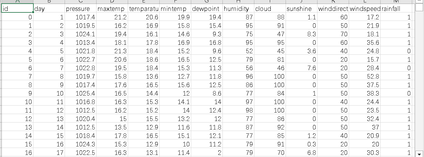 本研究采用气象数据集,包含某地区101天的观测记录,涵盖气压、温度、湿度等12项气象指标及降雨标签。数据预处理阶段完成以下关键操作:剔除样本编码与时间标记,聚焦气象要素;对风向进行角度标准化处理;通过箱线图识别并修正风速异常值。