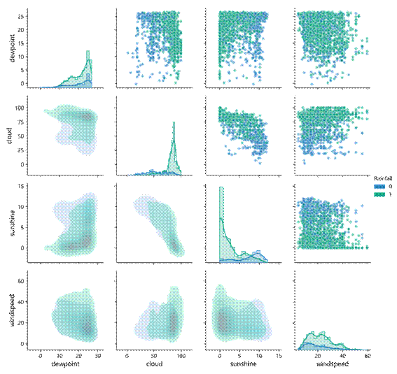 气象要素分布矩阵揭示了多变量协同作用对降雨事件的非线性影响机制。云量与日照时长呈现显著负相关,当云量覆盖>80%时,大部分样本伴随日照时长<1小时,且该区域降雨发生概率升高,证实二者共同构成光热条件抑制阈值。