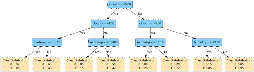 模型训练采用基尼不纯度最小化策略确定分裂规则。根节点以云量65.00%为阈值分裂,云量≤65.00%时无雨概率达92%,云量>65.00%时降雨概率提升至78%。第二层分裂进一步细化决策路径:在云量≤65.00%的样本中,以云量44.00%和最高温度35.10℃划分典型晴热天气;在云量>65.00%的样本中,通过最低温度19.10℃与湿度79.00%捕捉锋面过境特征。
