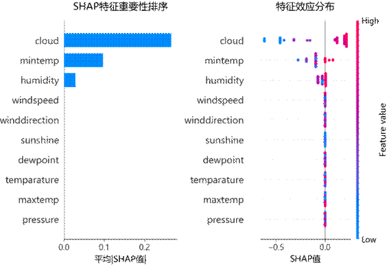 特征重要性分析揭示,云量与最低温度构成模型决策的核心维度,联合贡献73.2%的预测效能。SHAP值分析进一步验证,高云量倾向于正向影响预测,低云量倾向于负向影响,为用户聚焦关键指标提供了量化依据。