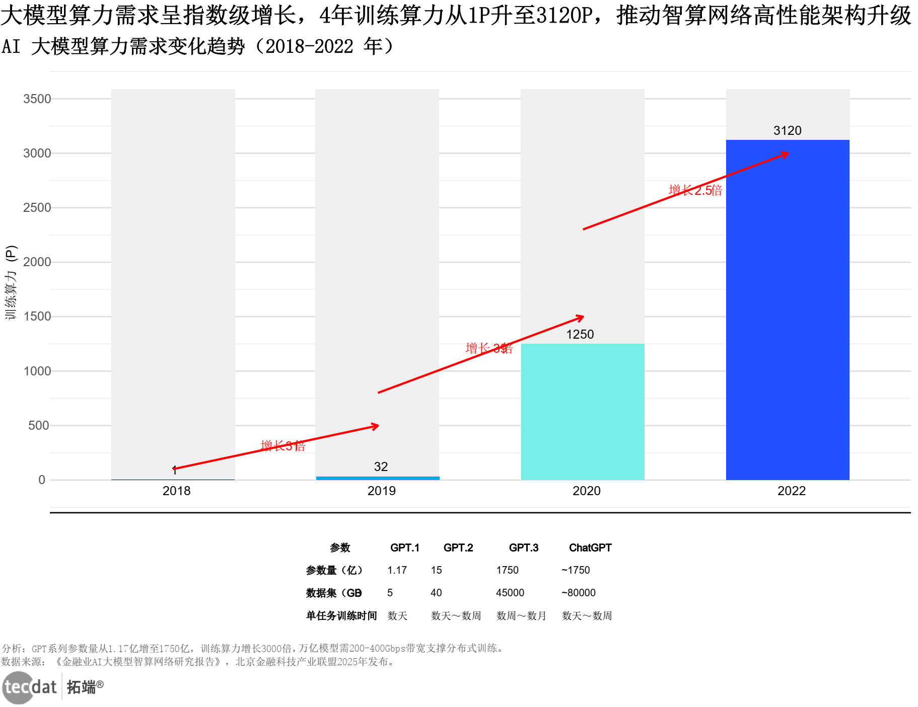 算力需求的指数级增长倒逼基础设施升级。从GPT-1的1P算力到ChatGPT的3120P,四年间训练算力需求增长3000倍,工商银行的实践表明,千亿参数模型千卡并行训练时,张量并行通信量达567GB/迭代,迫使金融行业构建“高性能连接+高效率传输”的智算网络架构。