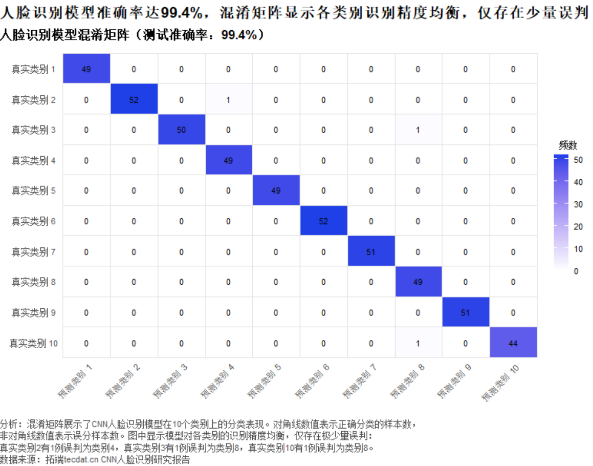 混淆矩阵结果显示,多数类别的正确分类数达到49或52,仅少数类别存在个别误判,表明模型对各类别的识别能力较为均衡,整体性能优异。