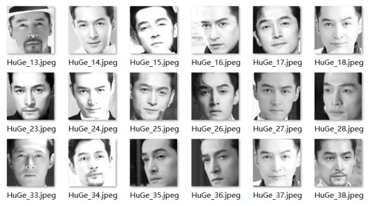 我们选取了10位演员的人脸图像作为基础数据集,共计1100张原始图片。数据存储采用结构化方式,在source文件夹下创建10个以演员姓名命名的子文件夹,图片命名为“姓名_数字.jpeg”。