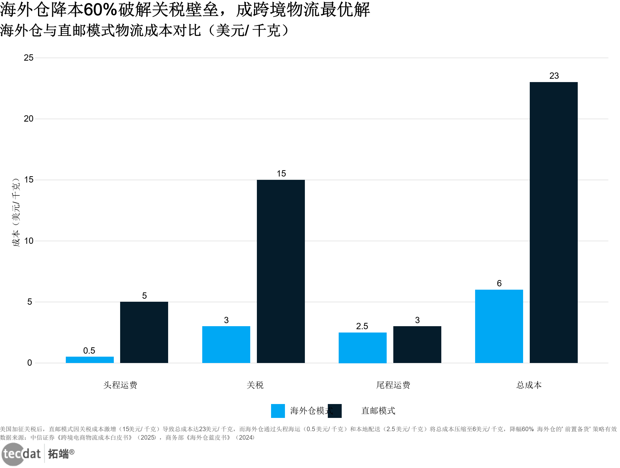 美国关税政策调整成为跨境物流模式转型的催化剂。直邮模式因头程运费(5.0美元/千克)和关税(15.0美元/千克)居高不下,总成本达23.0美元/千克;而海外仓通过海运头程(0.5美元/千克)和本地配送(2.5美元/千克),将总成本压缩至6.0美元/千克,降幅达60%。