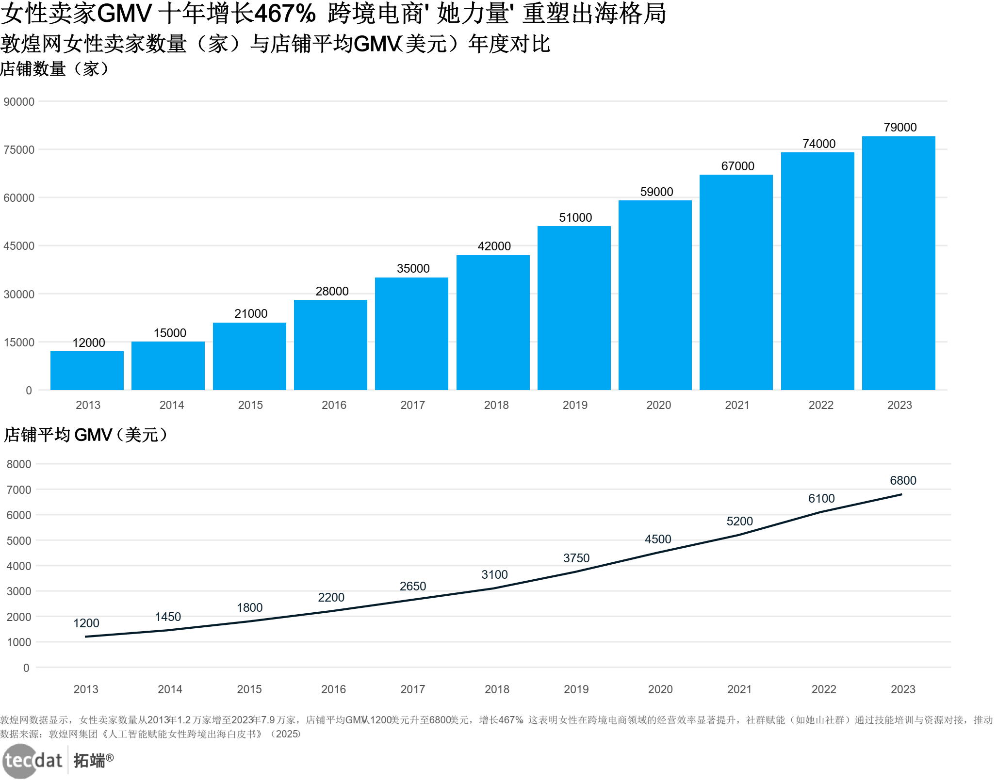 敦煌网数据显示,女性卖家数量从2013年的1.2万家增至2023年的7.9万家,年均复合增长率达20%;同期店铺平均GMV从1200美元升至6800美元,增长467%,远超行业平均增速。这意味着女性卖家已从“小规模试水”转向“规模化经营”,其中30%的头部卖家实现年GMV超10万美元。