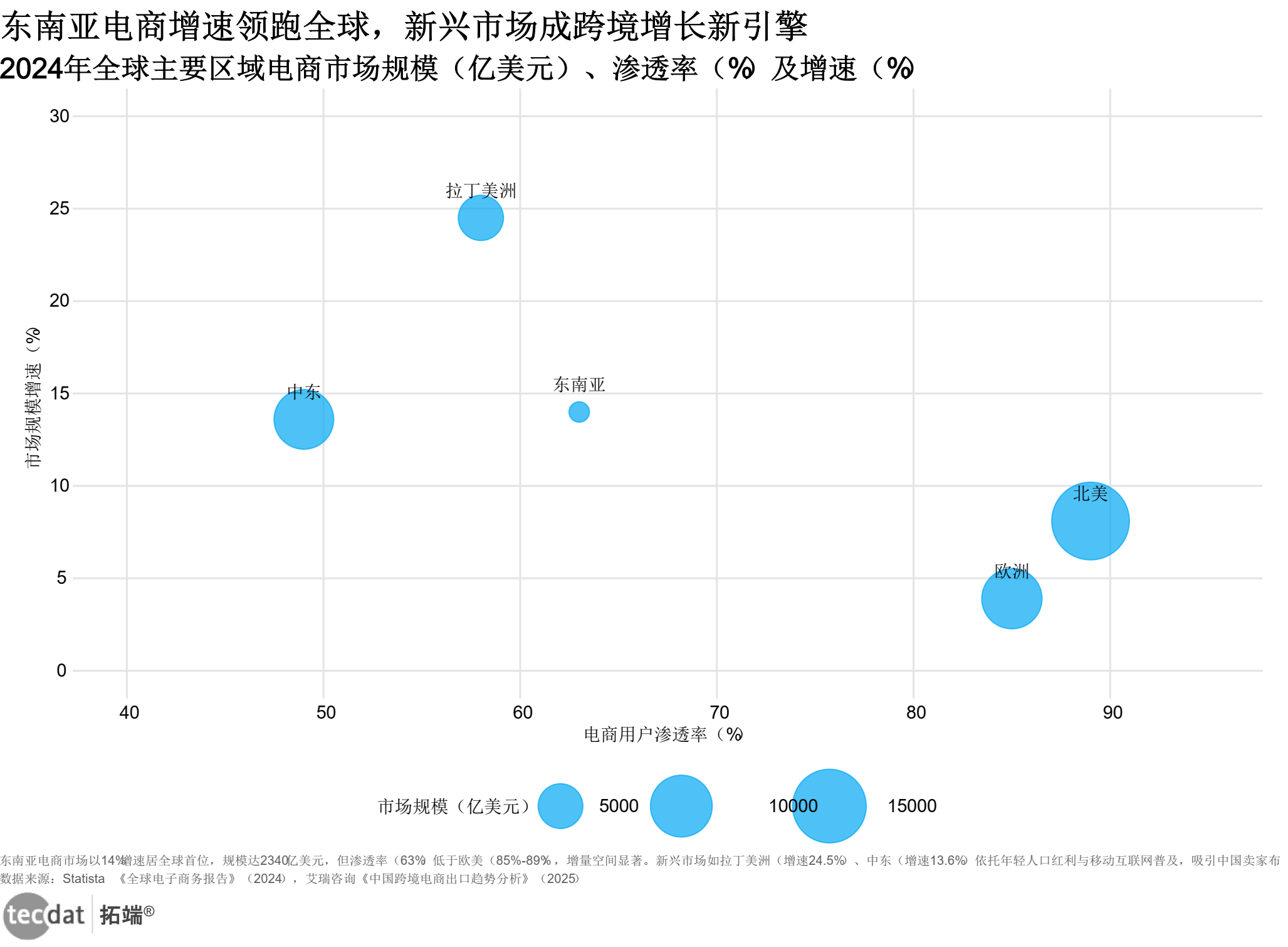 全球电商版图正经历深刻重构,不同区域市场呈现出差异化的增长特征。东南亚、拉丁美洲等新兴市场凭借人口红利与数字化渗透,成为跨境电商增长的主引擎,而北美、欧洲等成熟市场则通过消费升级创造高端需求。