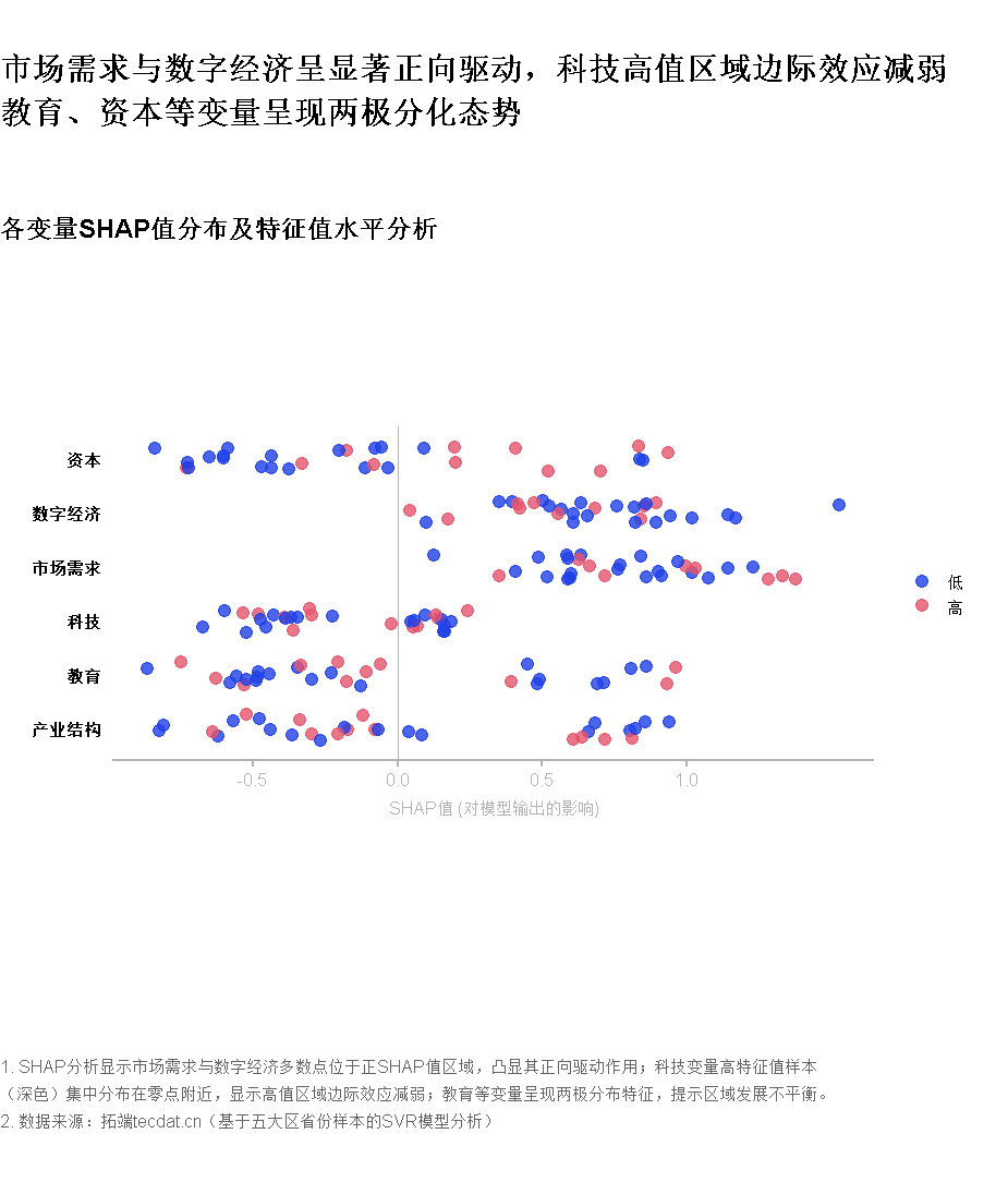 这个项目最终形成的分析框架,或许能给更多关注区域协调发展的同仁带来启发。我们选取了五大区内的省份作为分析样本,通过支持向量回归(SVR)模型结合SHAP值分析,拆解了科技、数字经济、市场需求等六大因素的实际作用。整个过程就像给区域发展做“CT扫描”:先用模型摸清各因素的整体影响力,再用可视化图表呈现区域差异,最后针对性地给出资源配置建议。
