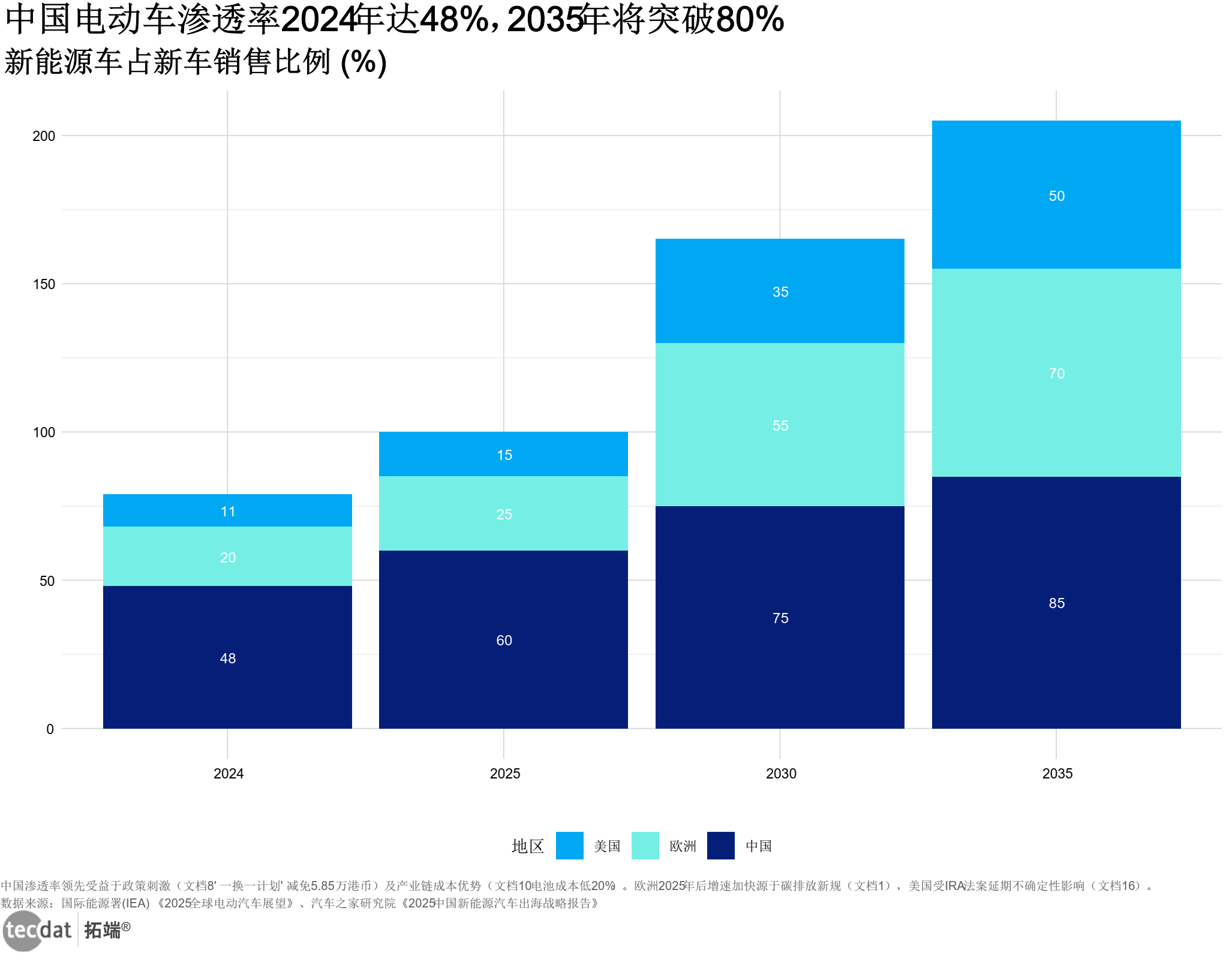 | 《IEA:Global EV Outlook 2025》 | 中国2035年电动车渗透率85% | 比标普预测高5个百分点 | 统计范围不一样:IEA包含插电混动,标普只算纯电 |