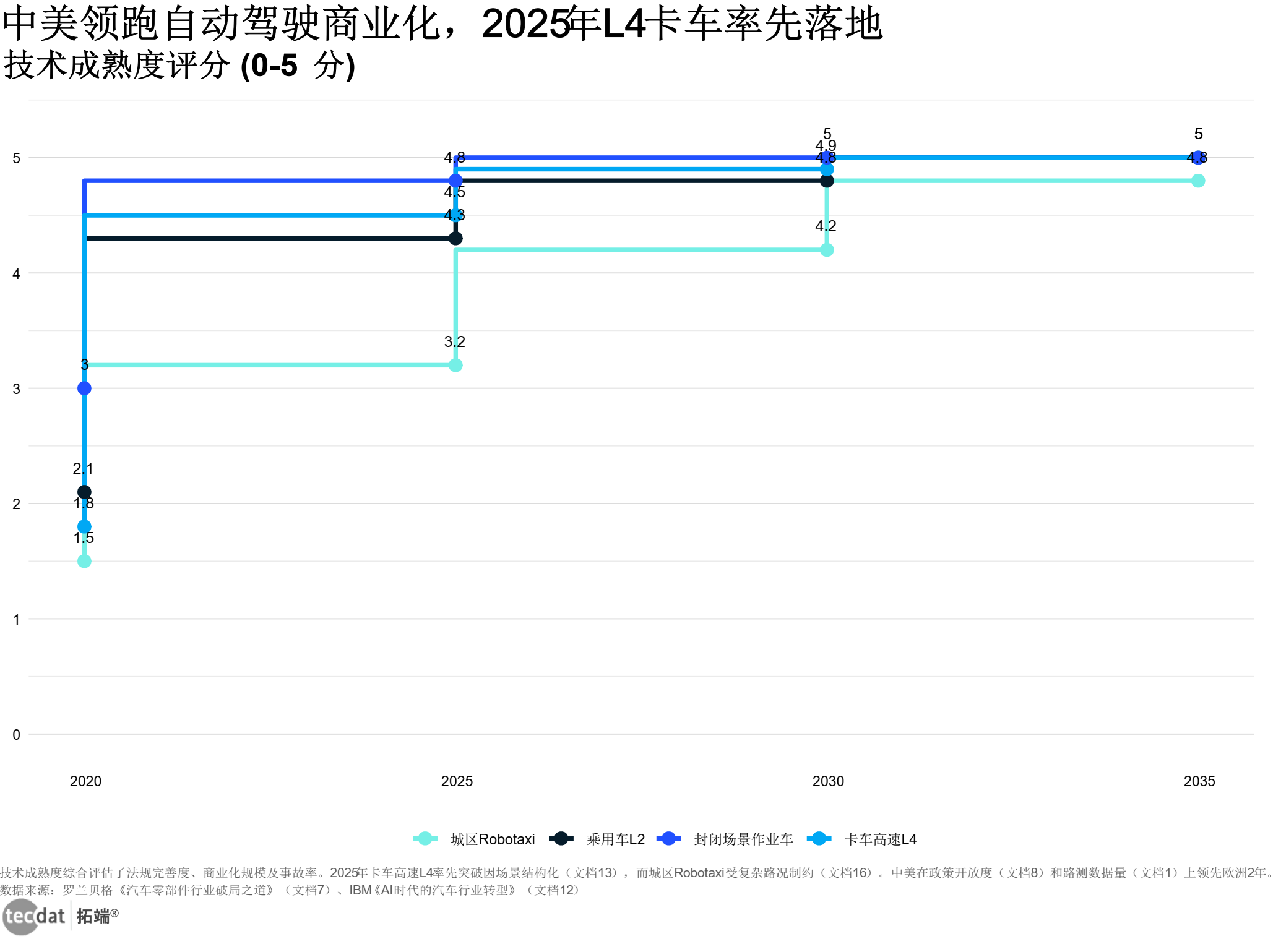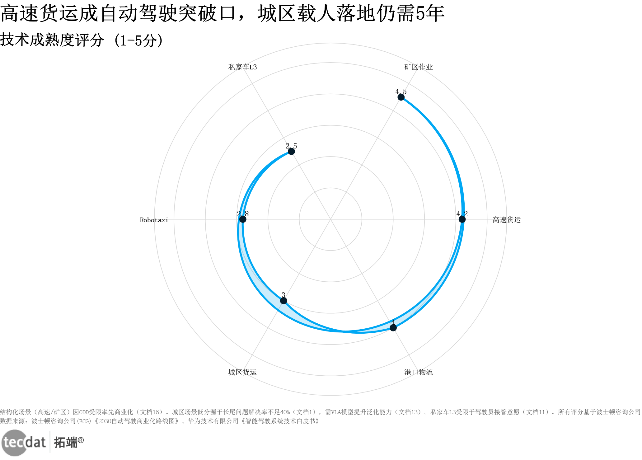 到了2025年,卡车高速L4的成熟度达到4.5分,率先实现突破。这是因为高速公路场景结构化程度高,车道线清晰、交通流稳定,算法更容易处理。反观城区Robotaxi,由于要应对行人横穿马路、突发交通事故等各种难以预测的情况,成熟度只有3.2分,要实现大规模落地估计还得等5年以上。