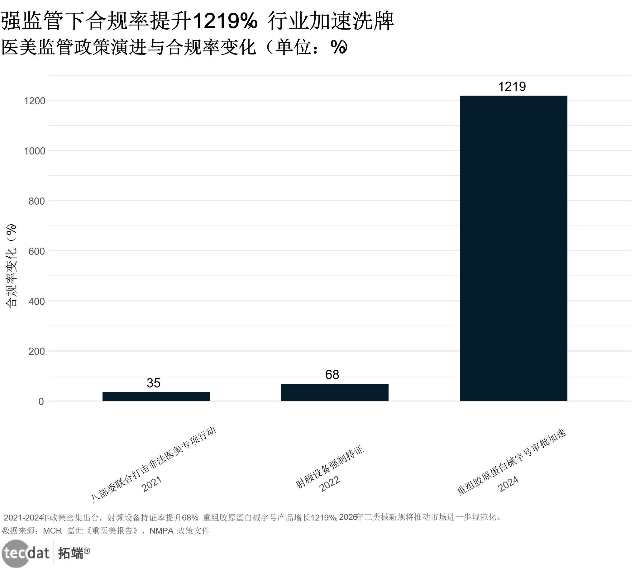 2021-2024 年,监管从 “全产业链清查” 转向 “细分领域规范”:射频设备合规率提升 68%,重组胶原蛋白械字号产品增长 1219%。未来的竞争核心,在于 “医疗本质 + 技术创新”—— 机构需从 “营销驱动” 转向 “疗效复现”,企业要在材料研发中融入 “分层抗衰” 的医学逻辑。