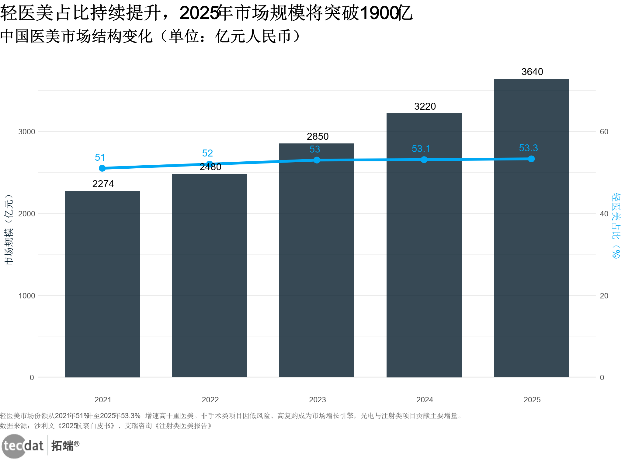2021-2025 年,中国医美市场规模从 2274 亿元跃升至 3640 亿元,轻医美占比从 51% 微增至 53.3%。这一变化的核心密码,藏在消费者的 “决策天平” 里 —— 他们更爱 “低风险、高复购” 的项目:光子嫩肤因 “午休式治疗” 成机构流量入口,玻尿酸和肉毒素合计贡献超 60% 的注射类市场份额。
