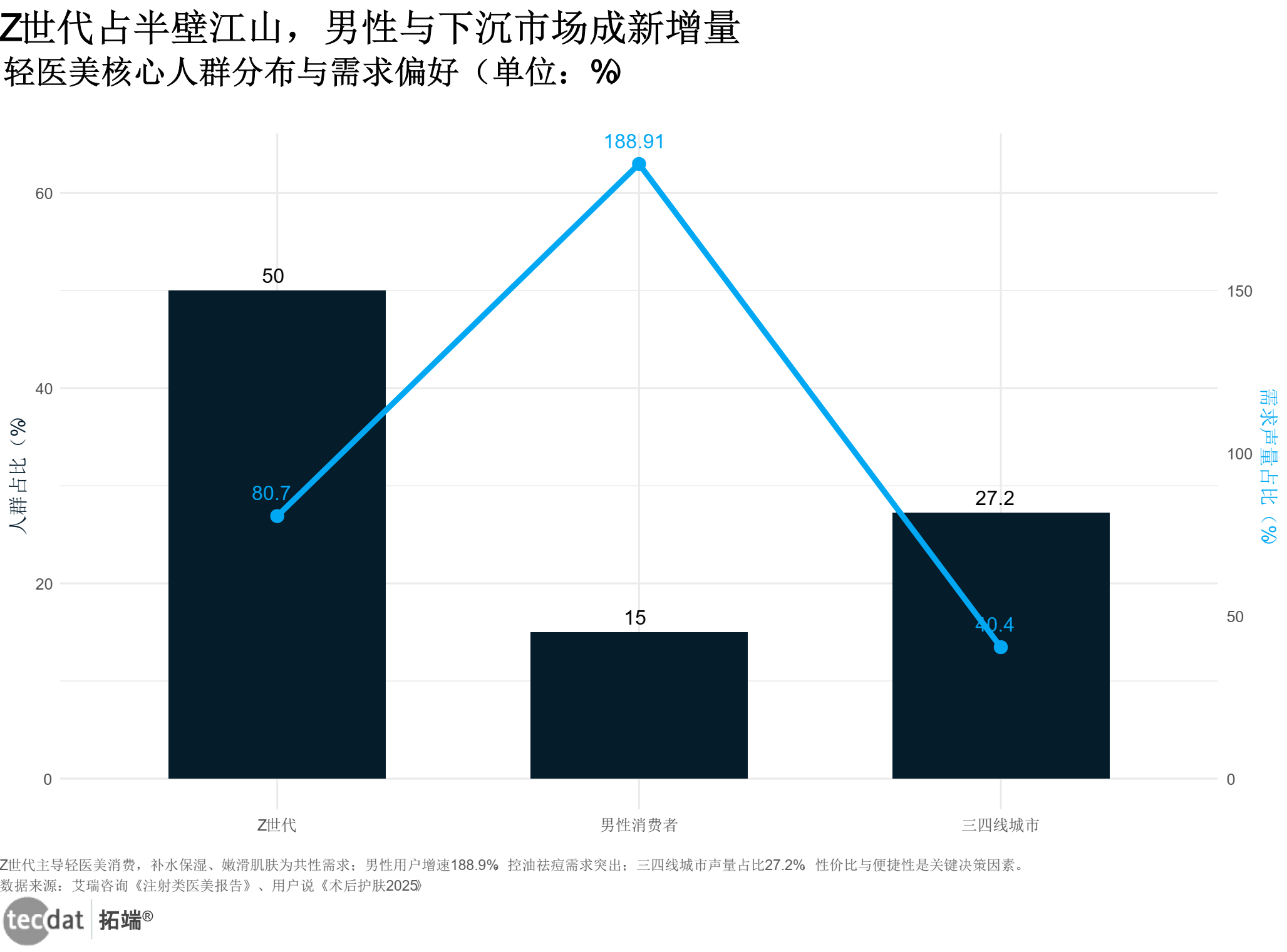 Z 世代撑起轻医美半壁江山(占比 50%),对他们而言,水光针不是 “医美项目”,而是 “进阶护肤品”;男性用户增速飙至 188.9%,控油祛痘、下颌线塑形成核心诉求。技术端同样暗流涌动:PLLA 等再生材料靠 “刺激自体胶原再生” 实现 62% 增速,重组肉毒素纯度突破 99%,正在改写市场规则。