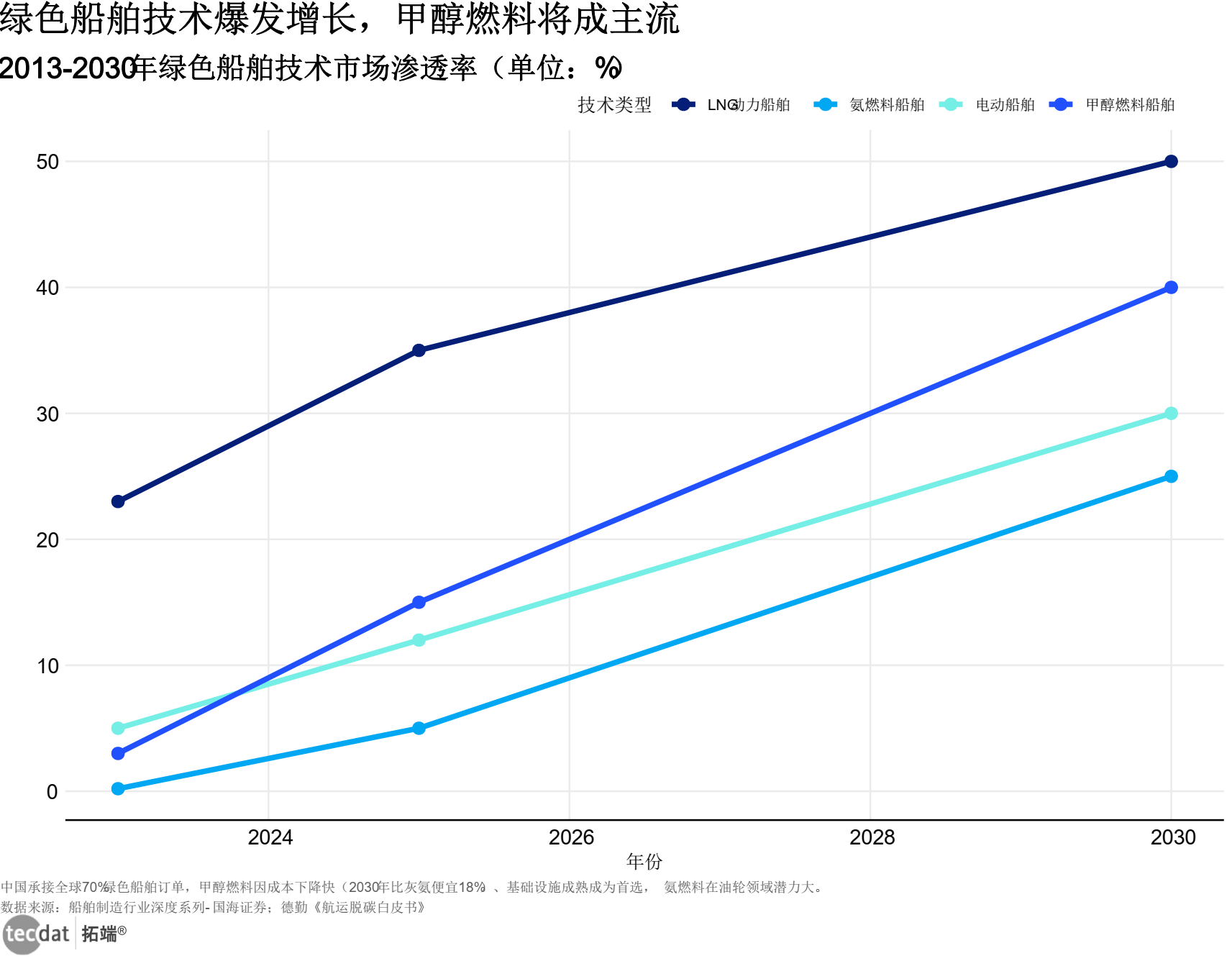 | 绿色船舶 | 甲醇燃料2030年渗透率40% | 国海证券35% vs 德勤40% | 统计范围差异:德勤含油轮,国海仅集装箱船 |